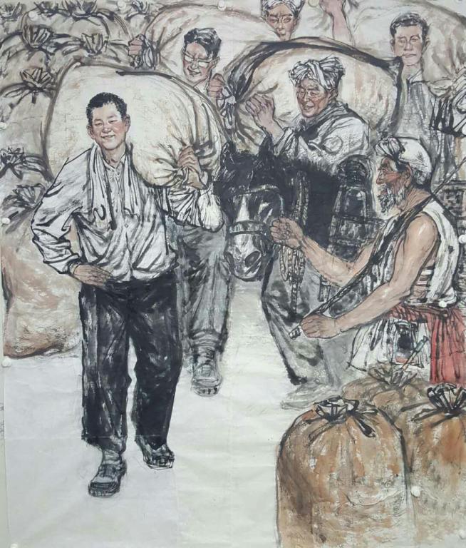 在画室,记者注意到一些已经装裱完成的作品,都是大秦岭画派画家、欧宝娱乐官方app教师的作品。有尹琨的《团结就是力量》,展示了抗美援朝中战士们过鸭绿江的情景,表达了爱国主义、革命英雄主义、革命乐观主义的抗美援朝精神。刘武安的油画《磨面机的故事》,再现优秀知青习近平用奖给自己的摩托车给梁家河的群众换来第一台磨面机,为梁家河和周围群众磨面带来了方便,给村里带来了经济收入。表现了忠诚、担当、奉献、吃苦的知青精神。魏艳丽、张鸽舞、牛二春三人一起合作的《修水坝》反映了年轻的支部书记习近平一班人从长设想,解决旱地灌溉难题的故事。表现青年习近平的高尚品德、远大志向和为民情怀。以及《雷锋精神之学雷锋》《洪掠》《滋润》《好后生》等,都以独特的视角表达了人民群众对社会主义建设者的崇敬,对红色精神以至中国精神的弘扬、创造和丰富。