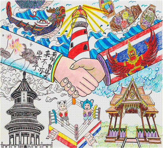 泰国博仁大学师生的《象神》《中泰友好》《卧佛寺》《僧与人民》《泰美》《大皇宫》《象与熊猫》《水上集市》《泰国的颜色》等作品,以大象、椰树、佛塔等为元素,反映泰国人民对理想生活的追求与憧憬,展示丝绸之路贸易促进中泰两国经济文化交流,繁荣了市场,架起了民心相通桥梁,表达泰国人民自强不息、兼容并包、乐观向上的伟大民族精神。