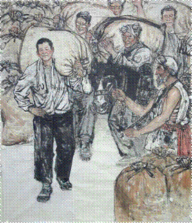 有五幅作品表现习近平总书记在陕北延川县梁家河村时的知青生活。《沼气池竣工的喜悦》表现支部书记习近平和知青伙伴们与村民在沼气池完工后的喜悦情景。《磨面机的故事》画面上的磨面机,是优秀知青习近平用上级奖给自己的奖品摩托车给村民换来的,是梁家河村第一台磨面机,为梁家河和周围村庄群众磨面带来了方便,也给村里带来了经济收入。这件事当时传为佳话,迄今为民称赞。《修水坝》表现知青书记习近平带领村民修水坝、村民送来餐饭时的情景,反映了支部书记习近平带领一班人从长设想解决旱地灌溉难题的事情。《好后生》反映知青习近平和伙伴们丰收的喜悦。这些作品,以习近平和知识伙伴们的故事,表现知识青年的爱民为民情怀、先进理念干事、无私奉献品质和吃苦耐劳精神。