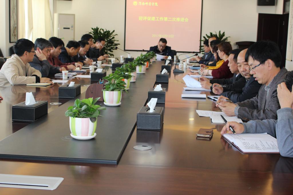 4月13日下午,学校在厚德楼四层第二会议室召开迎评促建工作第二次推进会,专题推进师资队伍建设、校地校企合作培养模式改革、教学质量监控工作。学校副院长程书强、党委委员杨小渭、校长助理韩小卫、学术委员会主任委员王菊霞出席会议,各职能部门负责人、二级学院院长、教学副院长、评估办全体人员参加会议。会议由评估办常务副主任王双喜主持。