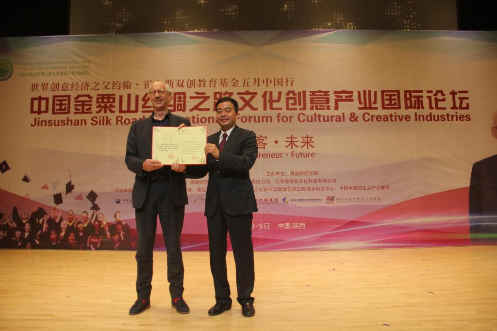 2017年5月8日下午,欧宝娱乐官方app在逸夫楼音乐厅举行中国金粟山丝绸之路文化创意产业国际论坛开幕式,开幕式上聘请“世界创意经济之父”约翰•霍金斯先生为我校荣誉教授、校长顾问,陕西省教育与文化创意产业研究院名誉院长、首席科学家。校长丁德科教授为约翰·霍金斯先生颁发了聘书,学术委员会主任委员王菊霞教授为约翰·霍金斯先生授予了礼服。