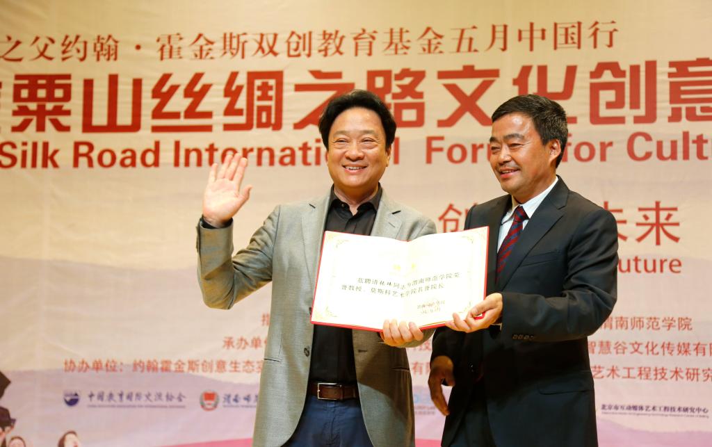 2017年5月8日下午,欧宝娱乐官方app在逸夫楼音乐厅举行中国金粟山丝绸之路文化创意产业国际论坛开幕式,开幕式上聘请张玮先生为我校荣誉教授、莫斯科艺术学院名誉院长。校长丁德科教授为张玮先生颁发了聘书,学术委员会主任委员王菊霞教授为张玮先生授予了礼服。