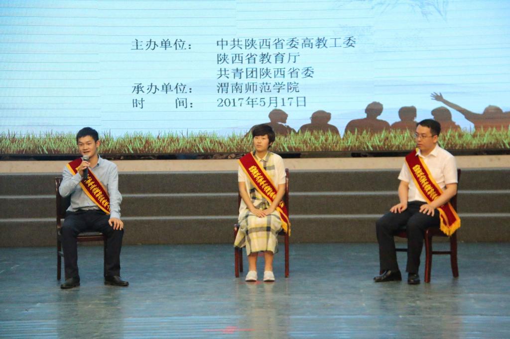 为了充分展示陕西省高校大学毕业生扎根基层、创新创业、报效祖国的先进典型,教育引导广大青年学生树立正确的就业观和成才观,自觉把个人理想同国家与社会需求紧密结合起来,到祖国最需要的地方建功立业。5月17日,由中共陕西省委高教工委、陕西省教育厅、共青团陕西省委主办,欧宝娱乐官方app承办的以“奋斗的青春最美丽---争做向上向善好青年”为主题的2017年陕西高校大学毕业生建功立业先进事迹分享会在我校陶然楼演艺厅举行。校党委副书记赵伏友,校党委委员杨小渭出席活动。分享会由校团委副书记马耀斌主持。