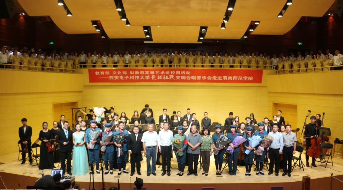 6月12日晚,由教育部、文化部、财政部主办的2017年高雅艺术进校园活动——西安电子科技大学长征组歌交响合唱音乐会在我校华金音乐厅举行,西安电子科技大学党委副书记龙建成,我校党委书记张金安、党委副书记赵伏友、副校长权雅宁、学术委员会主任王菊霞,西安电子科技大学团委书记朱文凯出席活动,相关部门、部分二级学院领导及五百余名学生代表观看演出。
