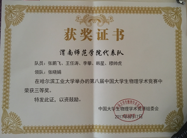 8月13日至17日,第八届中国大学生物理学术竞赛(简称CUPT)在哈尔滨工业大学如期举行,来自南开大学、清华大学、浙江大学、南京大学、复旦大学、西安交通大学等73所高校的74支代表队参加了本次竞赛,另有26所高校派队观摩了此次比赛。我校今年首次组队参赛,经过几轮校内赛和陕西省省赛,最终选拔出1个参赛队参加此次比赛,在经验不足、仪器有限等情况下,师生克服种种困难,经过与西南交通大学、哈尔滨工业大学、华中科技大学、渤海大学、北华航天工业大学、华东师范大学等高校经历5轮共20场的激烈辩论,最终荣获全国“三等奖”。