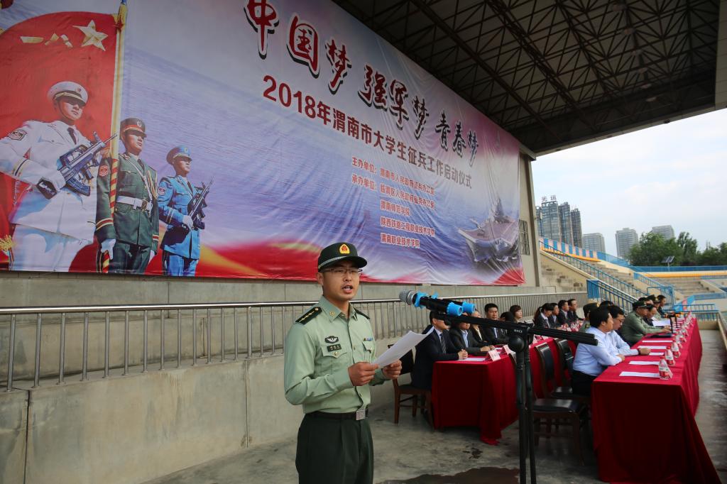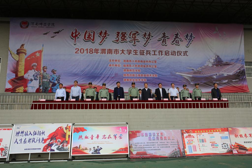 5月11日上午,渭南市2018年大学生征兵启动仪式在我校田径运动场举行。渭南市委常委、常务副市长、市征兵工作领导小组组长张建军,市委常委、市征兵工作领导小组副组长军分区政治委员孔令锷、政治工作处主任侯鉴、动员处处长沈礼军,临渭区常务副区长王小奇,临渭区人武部部长吕拥军、政委王忠文,欧宝娱乐官方app院长卓宇、党委副书记任健,人武部部长崔启、副部长陈景西,各二级学院副书记,陕西铁路工程职业技术学院、渭南职业技术学院有关领导,我校师生共1800余人参加了启动仪式。