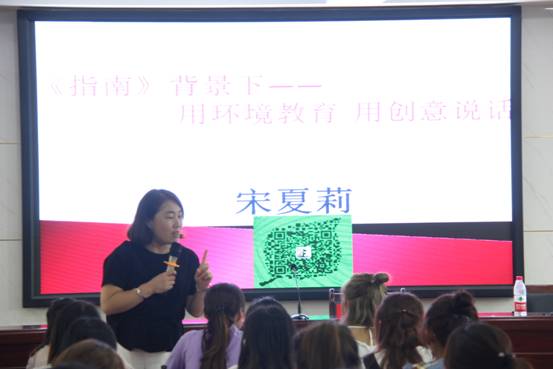上午,临渭区优秀园长办公室成员宋夏莉做了以“《指南》背景下——用环境教育,用创意说话”为题的环境创设讲座。宋夏莉以环境教育的四个要求——安全、教育、审美、个性做切入点,围绕“给孩子自己想要的,而不是我们想给的”这一中心思想,指出了现在幼儿园环境创设中存在的诸多问题,提出要遵从《纲要》指导,创设有助于促进幼儿成长、学习、游戏的教育环境;合理利用资源,为幼儿提供和制作合适的玩教具和学习材料,引发和支持幼儿的主动活动。她在讲座最后,向大家展示了优秀的环境创设的例子,真真切切的让学员们认识到了环境创设到底应该怎么做。宋夏莉在讲座期间多次与现场学员互动做游戏,用实例进行现场分析,寓教于乐,讲座现场气氛活跃,学员们热情极高。