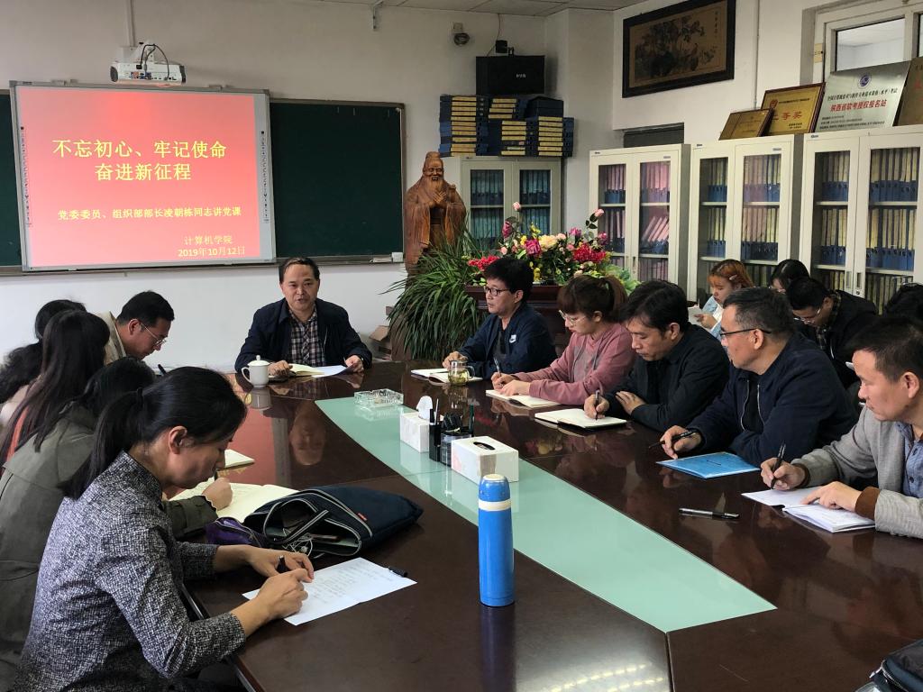 为进一步深化“不忘初心、牢记使命”主题教育学习,根据组织开展主题教育实施方案安排,10月12日下午,计算机学院党总支在学院5201会议室开展了专题党课学习。此次学习邀请了校党委委员、组织部部部长凌朝栋为师生党员讲授主题为“不忘初心、牢记使命、奋进新征程”的专题党课。