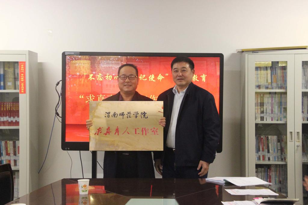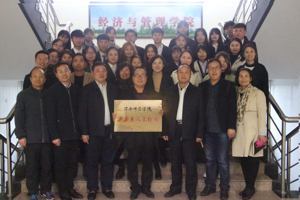 “求真育人”工作室负责人经济与管理学院党总支书记魏光民作表态发言。他首先向大家解释了“求真育人”工作室的取名缘由,并介绍了工作室前期建设情况和今后工作的思路打算。他说,“求真育人”工作室取名来自现代高等教育专家顾明远所言:“大学的使命就是求真育人”。“求真育人”工作室的工作目标和责任就是教育学生求真务实、健康成长、全面发展,做合格的“四有”新人。从今年4月以来,经济与管理学院在微信公众号上开设了“书记小喇叭”栏目,到目前已经播出31期,内容涉及思想教育、基层党建、主题教育、安全教育、地方文史等方面。节目播出后,收到了良好的教育效果和社会反响。据不完全统计,“书记小喇叭”栏目近期播出的节目在腾讯网点击观看人数达10000余人次,在学院微信平台师生浏览量达8000余人次,有的节目被大量转发,《渭南日报》等公众平台也转发了部分节目。魏光民表示,“求真育人”工作室正式挂牌后,标志着“书记小喇叭”栏目已经由以前的个人兴趣爱好转变为一种责任担当,由个人的自发行为转变为组织交给的一项使命,由一个学院的行为转变为全校的集体项目。因此,工作室将重新筹划,组织全校热心学生思想政治教育工作的同仁共同开展大学生思想政治教育工作的研究和探索。特别是,将从内容和形式上丰富、创新“书记小喇叭”栏目,不断为师生献上文化、教育的精神盛宴,力争将这一栏目打造成我校校园文化建设的特色平台和重要阵地。