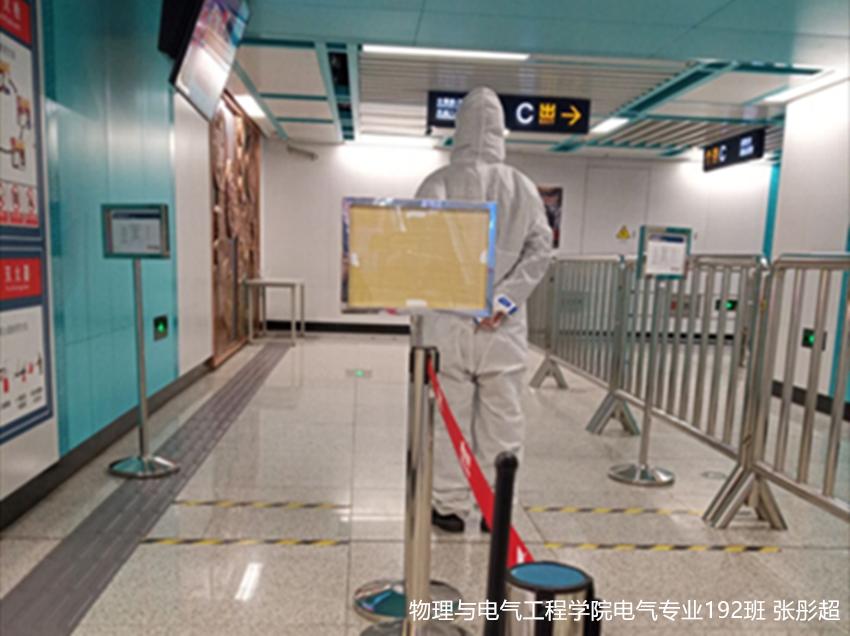 张彤超,物理与电气工程学院电气专业192班学生。在疫情防控的关键时刻,他在西安地铁四号线文景路站负责安检工作。每天穿着厚重的防护服,戴着口罩、手套对进站的乘客进行身份核查、体温检测,并对身体异常的旅客进行登记和重点排查。这期间,工作量急增,许多站点缺少人手,但在超负荷的工作和潜在的危险中,张彤超没有放弃,毅然选择坚守,不忘初心,不忘使命,投身抗疫,需要以身作则更需要勇于担当。