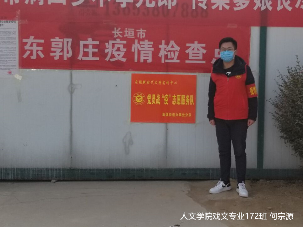何宗源,人文学院戏文专业172班的一名学生干部,面对突如其来的肺炎疫情,他主动加入到这期事先没有准备的“社会实践”中,报名参加家乡志愿工作,同党员干部、路政工作人员及其他青年志愿者一起协助村里的防控工作。同时,他还负责劝退点的所有卫生工作,为工作人员做好了后勤保障。他服务群众,深入一线,有序参与疫情联防联控,是一份赤子之心,更是一份对家乡的热爱和对生命的尊重。