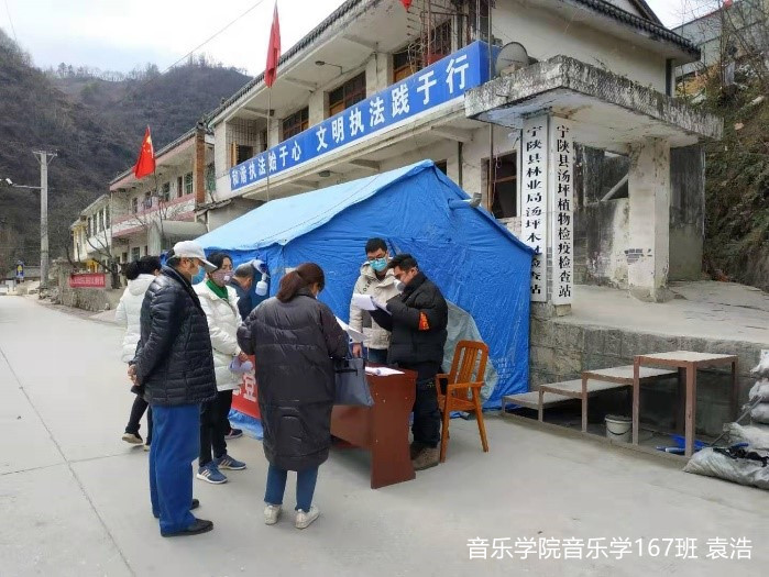 袁浩,音乐学院音乐学167班学生。身为学生干部,中共预备党员的他,在疫情发生后,积极响应学校号召,贯彻相关防控新型冠状病毒肺炎的文件精神,积极参与家乡安康市宁陕县的防疫工作,被分配到宁陕县城关镇汤平检疫组,进行出入人员的体温登记及巡查宣传工作。自1月23日起,他跟随工作人员实地走访住户300余户,登记询问住户出入情况和身体状况,逐一排查疫情,同时,登记外地返乡人员200余人,积极宣传防控疫情的重要性。他用自己的行动彰显了新时代大学生的精神风貌,展现了新时代团员青年责任与担当。