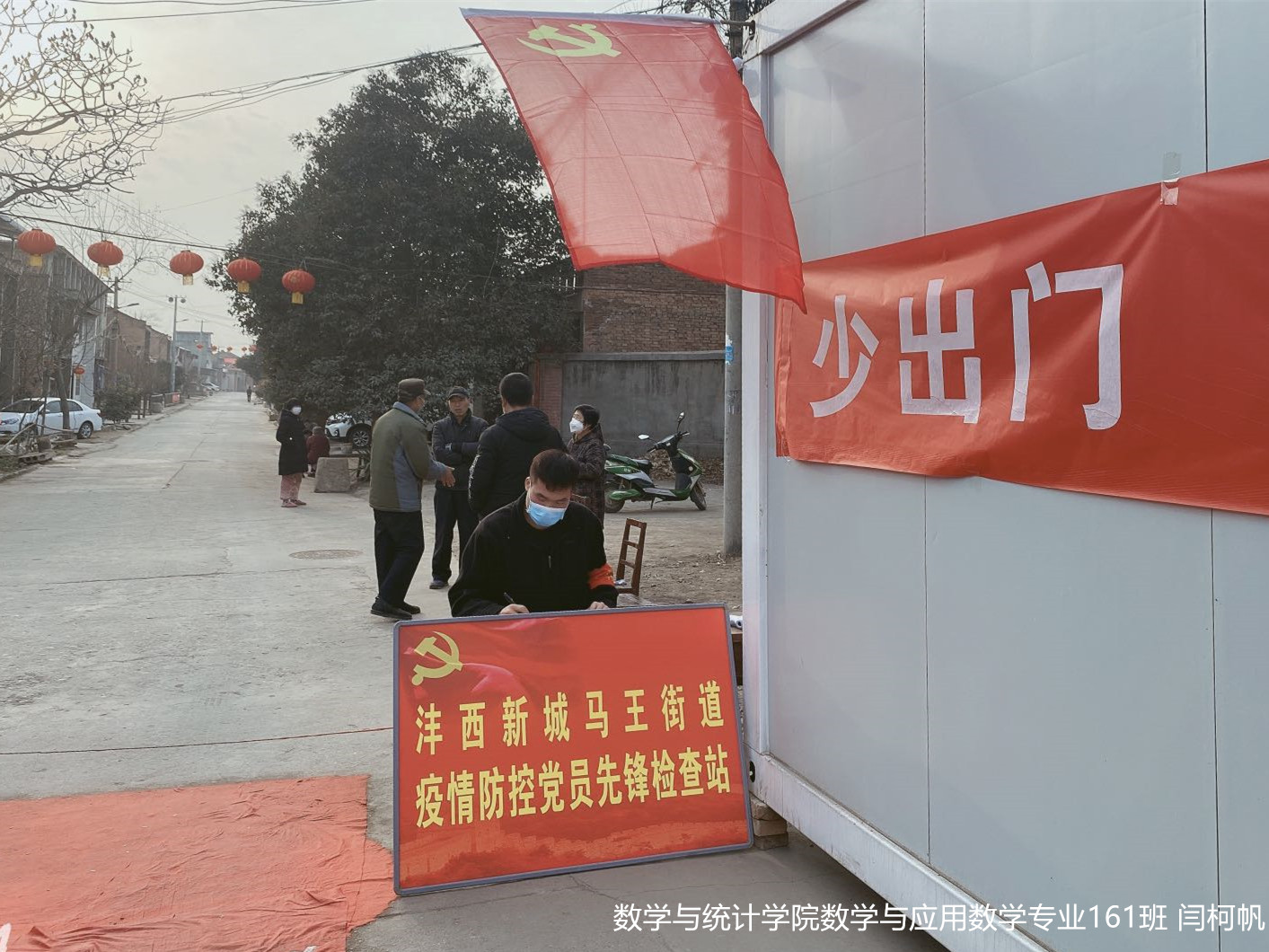 闫柯帆,数学与统计学院数学与应用数学专业161班学生,家住陕西省西咸新区沣西新城马王街道,是一名光荣的共产党员。疫情发生后,他积极响应家乡的疫情防控工作,成为一名志愿者,从大年初二开始在村口设卡处负责劝返外地人员及车辆进入本村,早7点到晚6点,寒风中的坚守更是为了家家户户的平安健康。闫柯帆主动帮助村委会工作人员张贴宣传公告,宣传防疫知识,并申请到村里挨家挨户走访摸排,为不了解疫情的老人和小孩普及注意事项。他说:“在抗击疫情,捍卫人民生命安全的重要时刻,滴水成溪,爱心凝结,每一分心意,每一点努力汇聚到一起,就会成为抗击疫情的庞大力量。”