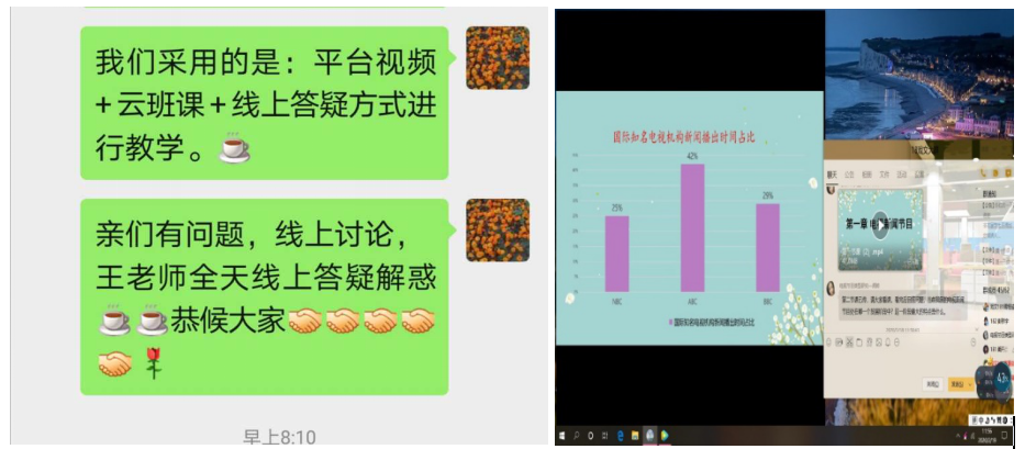 1.建立学习平台技术交流小组。针对文科老师教育技能力先天不足和畏难情绪,学院鼓励督促教师居家抗疫的同时,主动学习求变,积极参加人事处关于信息化教学能力培训线上课程;要求教师及时搜集整理试验相关网络平台的操作使用手册。针对不同学习平台,以技术熟练的老师为组长,形成了教学平台小组。王晓红老师的“云班课”教学组,姚亦登老师的“钉钉”教学组,聂风云老师的“学习通”教学组,孙慧玲老师的“优慕课”教学组,党艺峰老师的“腾讯会议”教学组等,利用各种渠道不断沟通交流,提高教育技术的使用能力,小组内部提供即时的在线技术支持。互帮互学,形成了良好的学习氛围,教师进一步提升了信息化教学能力,树立了信心。特别是一些年龄偏大的老师,从最初的顾虑,到中途的执著学习,最终实现了成功的在线教学。