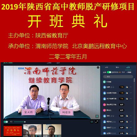 5月23日上午,由我校承办的“省培计划(2019)”——陕西省高中教师省级脱产研修项目(高中化学、信息技术)在线开班,这是我校教师培训项目线下转线上的首次尝试,此次培训由北京奥鹏远程教育中心提供技术支持。副校长王菊霞,继续教育学院院长史天胜、副院长周德锋,高中化学首席专家焦更生、高中信息技术首席专家杨方琦,专家团队19人以及来自省内10个地市的100名学员在线参加开班仪式。周德锋主持开班仪式。