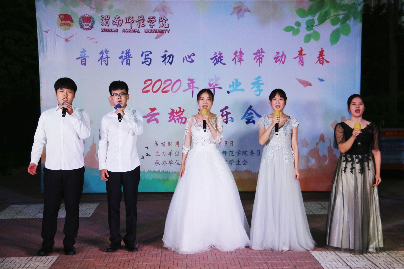 云端音乐会在音乐学院陶昱安等5人带来的《那段时光》中拉开帷幕。马克思主义学院的王一、解洋演唱的《平凡之路》,物理与电气工程学院杨琛波演唱的《追光者》,音乐学院张秦玉等5人演唱的《不忘初心》唱出了青年人的自信和勇气,只有保持初心,才能找到属于自己的未来。音乐学院王瑜等2人演唱的《同桌的你》,传媒学院候苛雨演唱的《稻香》,美术学院赵鹏凯演唱的《青春》,人文学院的胡苛演唱的《成都》,美术学院达雨梦演唱的《后来》,经济与管理学院马悦欣演唱的《七月上》唱出了校园生活的青涩与美好,唱出了青春最美的旋律,唱出了对校园生活的点滴回忆。莫斯科艺术学院刘朝阳演唱的《骊歌》,莫斯科艺术学院杨晓东演唱的《驼铃》,外国语学院李惠等2人演唱的《和你一样》,化学与材料学院王炳杰演唱的《这一路走来》,体育学院滑蕊演唱的《匆匆那年》唱出了青春校园里友情的真诚与可贵,唱出了对即将离别朋友的不舍。环境与生命科学学院李锦华演唱的《后会无期》,教育科学学院李筱演唱的《Here we are》,莫斯科艺术学院陈甄滢、冯雅茹演唱的《时间煮雨》,数学与统计学院侯海哲等20人演唱的《再见》唱出了校园时光的匆匆,唱出了离别时的忧伤,唱出了对毕业生的美好祝愿,蕴含着别样的珍惜。一首首动人的歌曲,诉说着渭师学子对母校的深情与热爱,也祝福着毕业生走向更美好的明天。