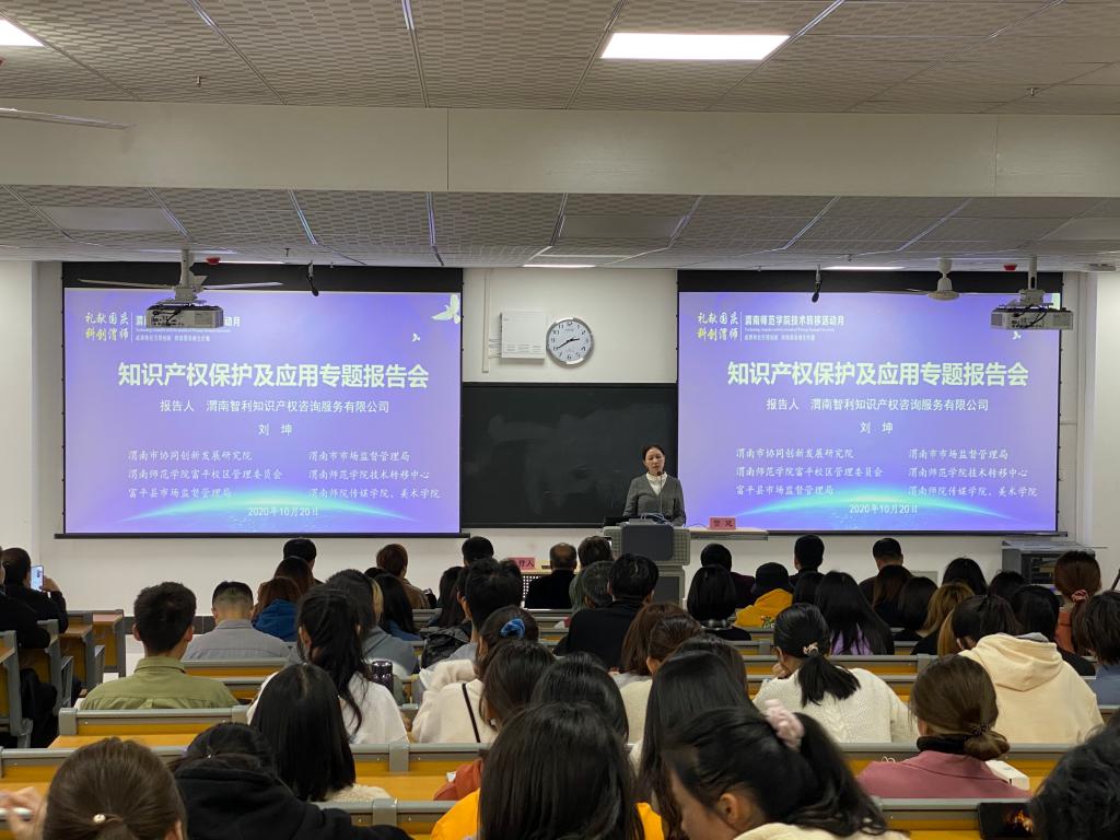 会上,渭南智利知识产权服务有限公司讲师团专家刘坤老师为学校师生作知识产权专题报告。刘坤从知识产权分类、知识产权申请与转让(许可)等角度向师生们作了细致讲授,讲解深入浅出、操作性强,现场师生们反响良好。