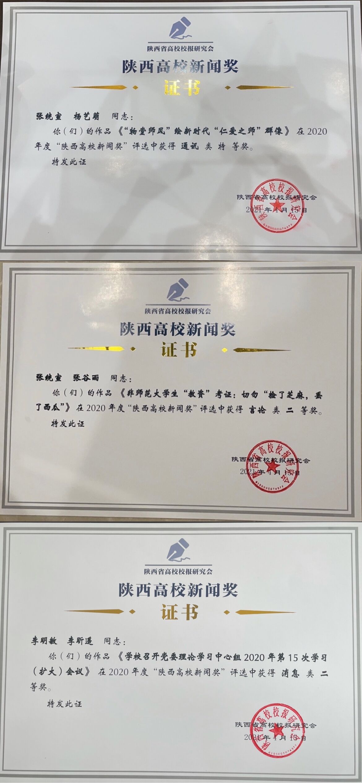 “陕西高校新闻奖”是陕西省高校校报研究会主持评选的行业奖项,每年评选一次,评选范围涵盖消息、通讯、言论、专栏、新闻图片及报纸版面等六大类。
