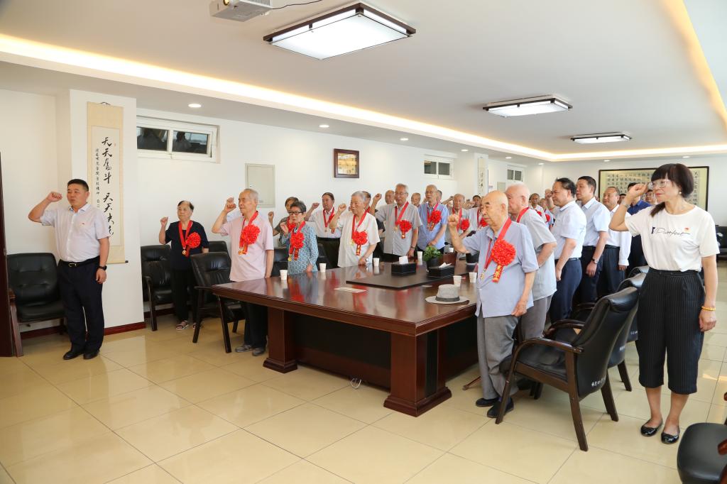 颁发仪式在全体与会人员唱国歌中开始。任健宣读学校“光荣在党50年”纪念章获得人员名单。卓宇为在场的25名老党员代表依次颁发纪念章,参会的党委委员依次与老党员们握手表示祝贺,并感谢他们为学校建设做出的贡献。随后,全体与会人员面对党旗,在卓宇的带领下重温了入党誓词。
