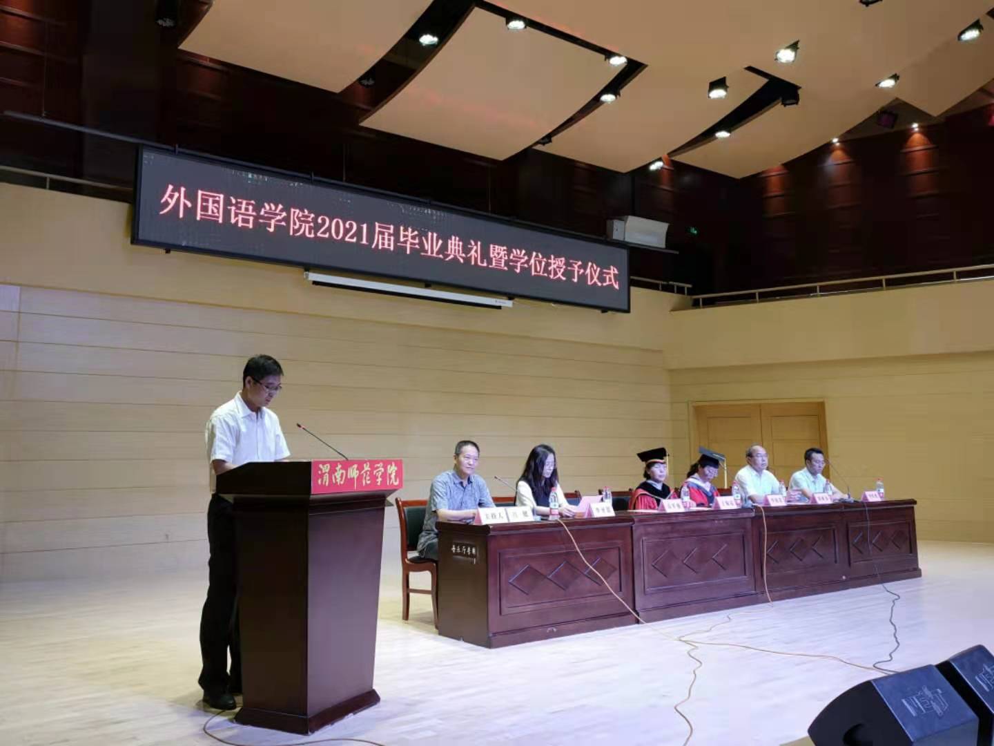 外国语学院副院长原林书宣读学校关于2021届本科毕业生毕业资格审核、学位授予资格审核结果,通报了外国语学院毕业资格审核及学位授予资格审核结果。