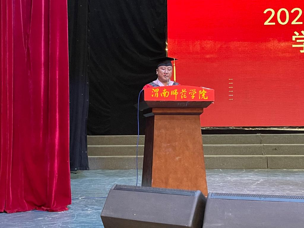 刘鹏代表音乐学院全体教师向毕业生们致以热烈的祝贺和衷心的感谢,祝贺同学们顺利完成本科阶段学业,走向人生更广阔的天地,感谢同学们给音乐学院留下的蓬勃朝气与青春活力。他寄语毕业生们:同学们,人生的舞台每个人都独一无二,每个人的角色和责任都无法被替代。除了你自己,没有人真正了解你责任的极限,除了你自己,没有人能够知道你的未来有多精彩。机遇与挑战并存,成功与责任同在,希望同学们勇敢承担责任,谱写无悔青春。