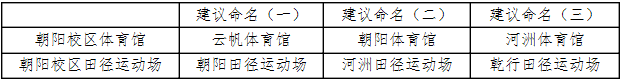 为加强校园环境建设,营造文化氛围,建设美丽欧宝娱乐官方app,学校于2020年5月份面向全体在职和离退休教职工、学生和校友开展朝阳校区体育馆、田径运动场命名征集活动。经2020年10月24日专家评审,现将朝阳校区体育馆、田径运动场建议命名公示如下。