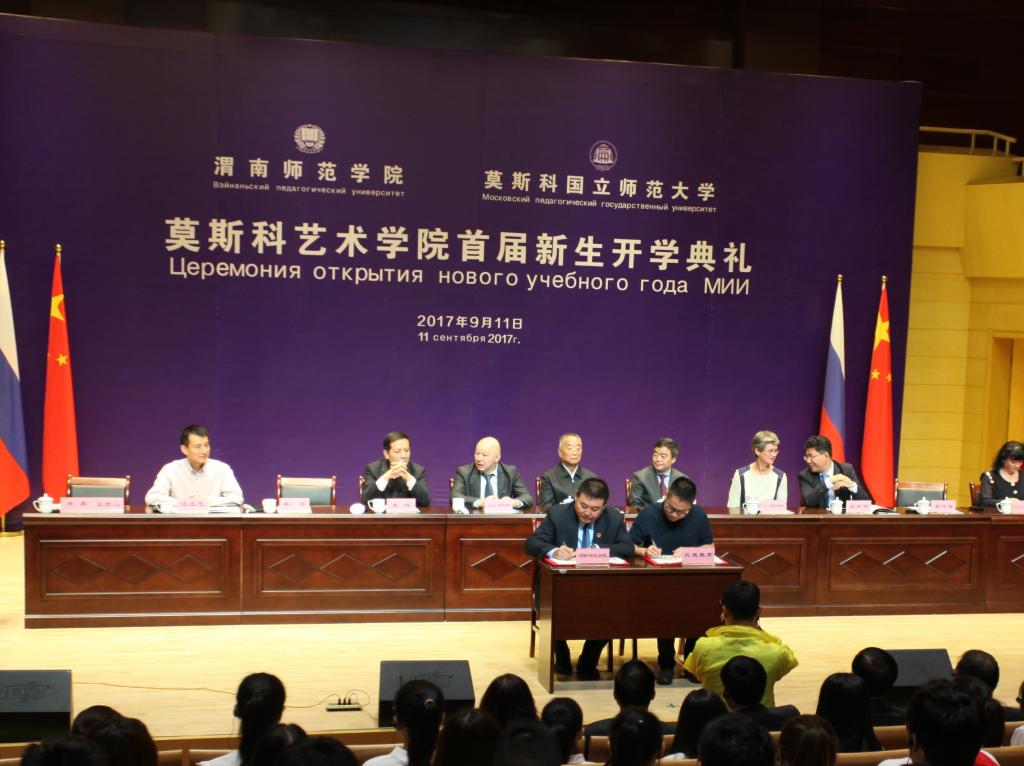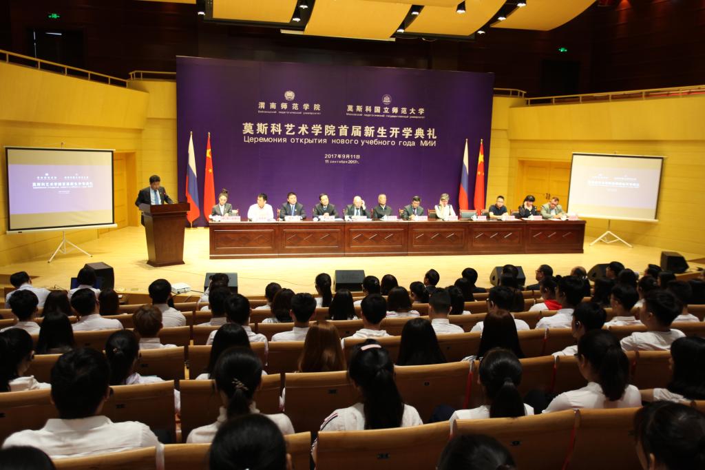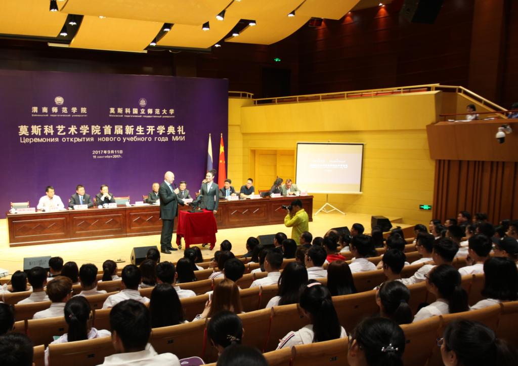 9月11日上午,欧宝娱乐官方app与莫斯科国立师范大学在欧宝娱乐官方app朝阳校区华金音乐厅联合举行中外合作办学机构“欧宝娱乐官方app莫斯科艺术学院”首届新生开学典礼。欧宝娱乐官方app杰出校友、原光明日报社总编辑、西藏自治区常委、宣传部部长苟天林,陕西省教育厅副巡视员李鸣,渭南市委常委、副市长吕培明,凤凰卫视集团•凤凰教育执行董事、行政总裁吴炜强,凤凰数字媒体教育执行总裁汪应忠,陕西省教育厅国际处副处长文通应邀出席,莫斯科艺术学院联合办学管理委员会副主任、莫斯科国立师范大学原副校长康斯坦丁•彼得洛维奇•多岑科,莫斯科国立师范大学副校长叶连娜•列奥尼多夫娜•博洛托娃,教师玛格丽特•尤里耶夫娜•巴拉莫诺娃、安德烈•阿列克谢维奇•科诺瓦洛夫,欧宝娱乐官方app党委书记丁德科,欧宝娱乐官方app院长卓宇出席典礼。典礼由莫斯科艺术学院院长梁晶主持。