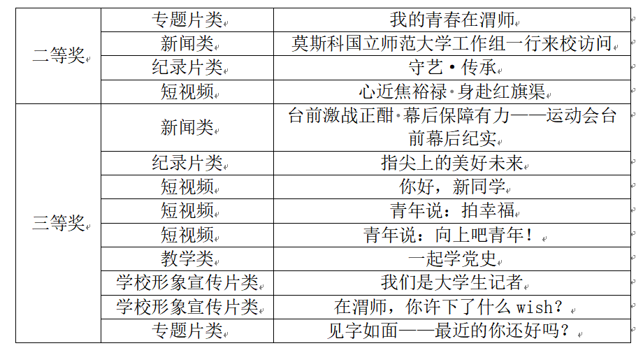 会上揭晓了“2024年高校影视作品交流展映”结果。我校电视台选送的视频作品分别获得新闻、专题、纪录片、短视频、宣传片等不同影片种类奖项13个,其中二等奖4项,三等奖9项。获奖作品题材和类型涉及广泛,有彰显我校一线青年教师风采的专题片《我的青春在渭师》,有传播非遗文化的纪录片《指尖上的美好未来》,有党的创新理论宣传节目《一起学党史》等优秀视听作品。