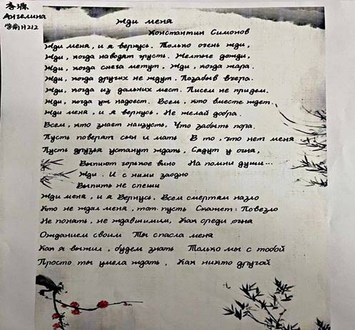 本次比赛的书写内容为俄国著名诗人布宁的《初雪》、西蒙诺夫《等着我》、安娜·阿赫玛托娃的《来看我》、丘特切夫《天空的云彩》四首诗歌。学生任选自己感兴趣的一首作品进行书写。共收到学生作品一百余份。经过评委认真评选,共评选出一等奖五名、二等奖十名、三等奖十五名。