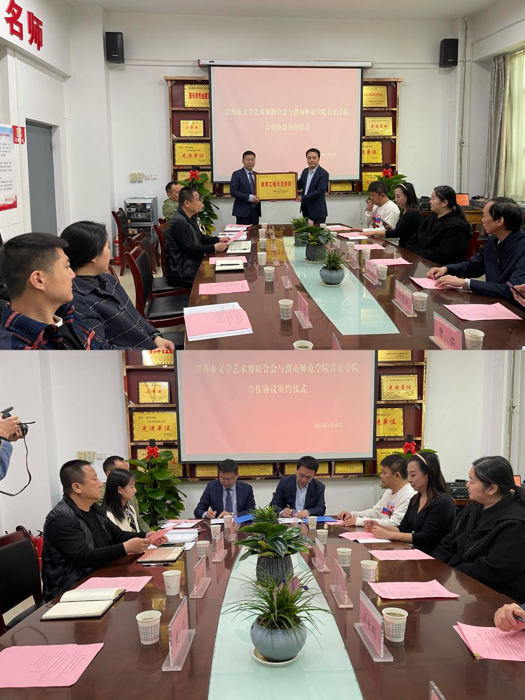 3月10日上午,音乐学院与渭南市文学艺术界联合会举行合作签约仪式。渭南市文学艺术界联合会主席张力、渭南市文学艺术界联合会副主席葛长明,欧宝娱乐官方app音乐学院院长刘鹏、副院长逯克刚以及渭南市音协、舞协和师生代表参加此了次活动。