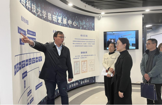 下午,调研组一行与陕西科技大学学工部部长张凯凯及学工部相关人员进行了座谈交流。张凯凯介绍了学生工作整体情况,网络思政中心干事蓝璟介绍了网络思政工作相关情况,学生资助管理中心主任臧晓辉介绍了阳光助学中心运营及管理模式。双方还就网络思想政治教育、辅导员工作考核与激励机制、“一站式”学生社区建设及辅导员就业指导能力提升等方面进行了深入探讨。随后,在网络思想政治工作中心主任李萌带领下,田耿辉一行实地参观了陕西科技大学网络思想政治工作中心,了解了中心的发展历程、平台建设、重点工作、特色活动,观看了“我在校园”智慧学工系统线上数据采集、分析及实时上报功能展示。