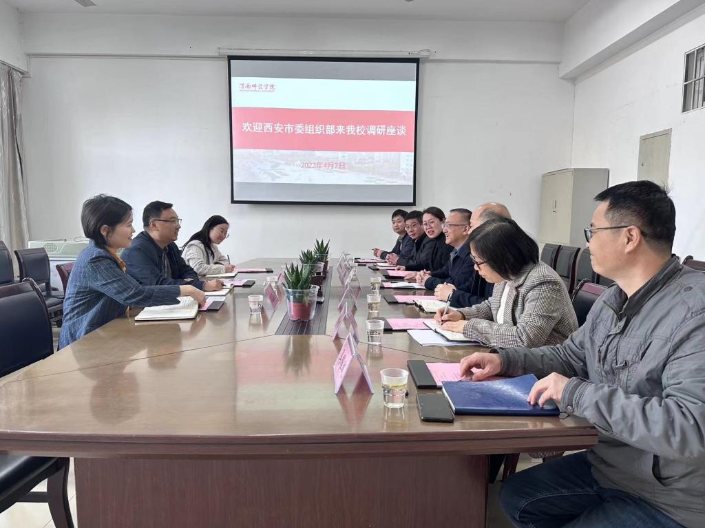 4月7日下午,西安市委组织部党员教育中心主任赵轩、干部宁侨侨和段苏宸一行来我校调研座谈。我校党委副书记袁亮出席座谈会,学工部部长田耿辉主持会议。