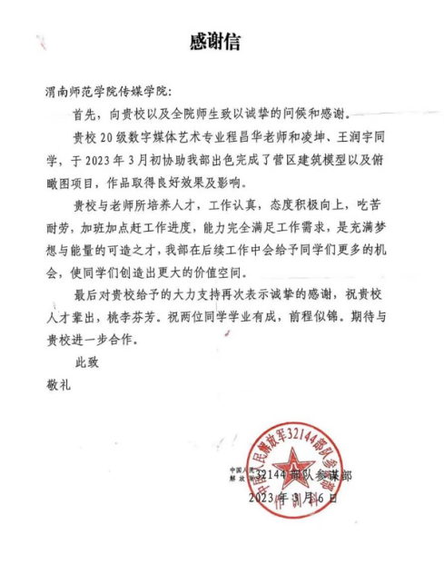 4月25日,我校传媒学院收到来自中国人民解放军32144部队参谋部的感谢信,信中对传媒学院数字媒体艺术专业教师程昌华、2020级数字媒体艺术专业凌坤、王润宇同学在2023年3月初协助中国人民解放军32144部队参谋部出色完成了营区建筑模型以及俯瞰图项目取得良好效果及影响表示肯定和感谢。