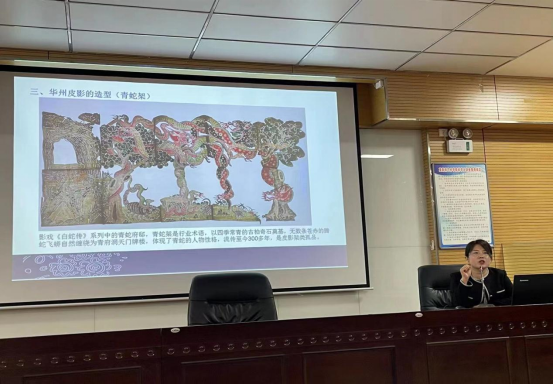 石洁从皮影的起源、造型特征、色彩特征入手,全方位介绍华州皮影图谱。随后,她以关中皮影为例,讲述了皮影拥有的浓厚地域色彩、艺术流派、制作方式和演绎方式,帮助学生更加全面了解皮影相关知识。