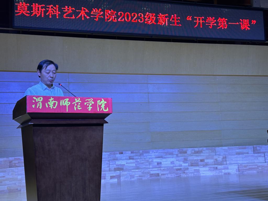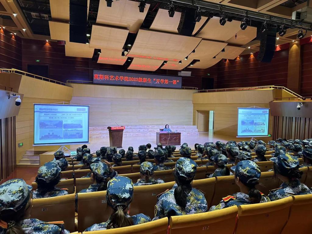 9月11日下午,校党委委员、副校长王菊霞为莫斯科艺术学院2023级新生讲授“开学第一课”。莫斯科艺术学院党总支书记孟波、副书记叶晓燕、学工办副主任段菲、全体辅导员及2023级全体新生参会。会议由孟波主持。