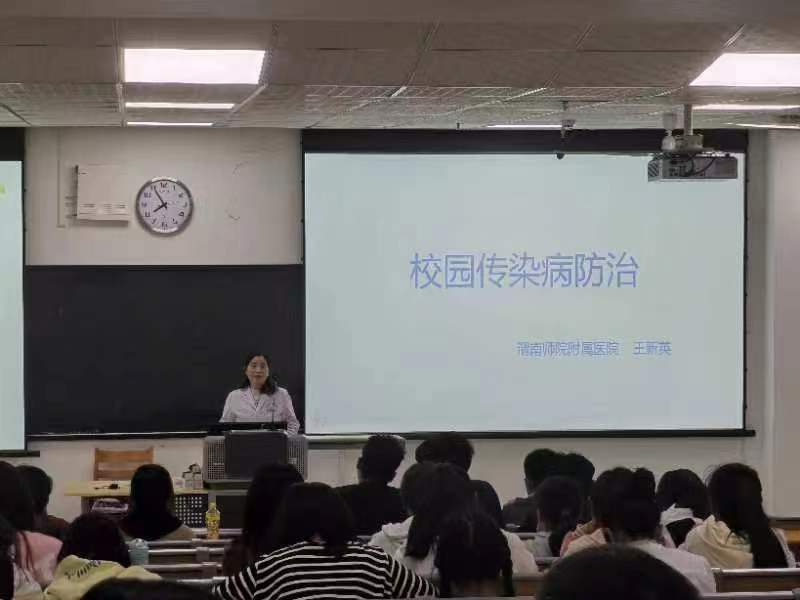 此次专题讲座的主讲人是富平县妇女儿童医院妇产科主任张艳和附属医院副院长王新英两位老师。首先,张艳结合数据、案例、图片等多种形式,向同学们详细讲解了艾滋病、梅毒、乙肝的概述、流行病学、临床表现、治疗和预后等知识。王新英重点讲解了肺结核、新冠肺炎及秋冬季常见传染病的相关知识。富平校区三个学院150余名2023级新生代表参加了此次讲座活动。