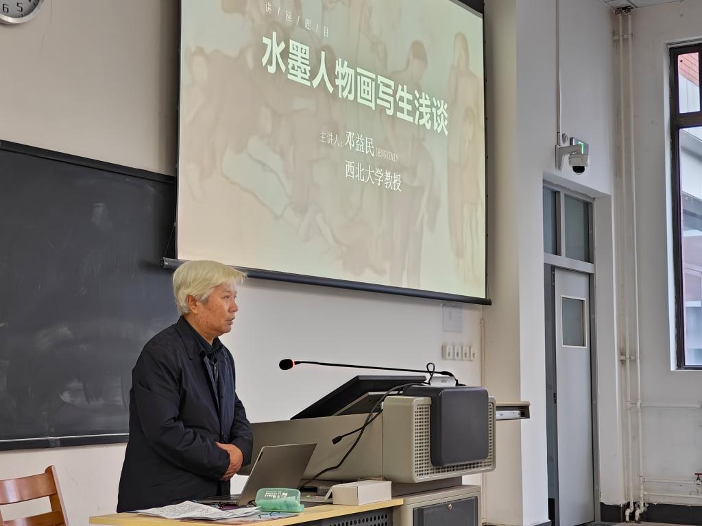 10月31日下午, 美术学院特邀西北大学邓益民教授到我校富平校区作“水墨人物画写生浅谈”学术讲座,参加本次学术讲座的有美术学专业教师与学生130余名,讲座由刘涌涛副院长主持。