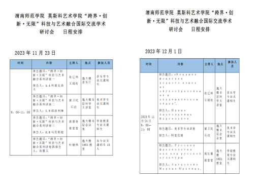 莫斯科国立师范大学教授、俄中统筹中心主任马克耶娃·艾琳娜作题为《俄罗斯风土人情---文化、饮食与习俗特色》的讲座;莫斯科国立师范大学艺术与造型系主任祖布里林·康斯坦丁作题为《艺术、科技及平面设计》的讲座;莫斯科国立师范大学雅安艺术学院科诺瓦洛夫·安德烈作题为《俄罗斯音乐作品与中国音乐作品交流》的讲座;莫斯科国立师范大学俄中统筹中心副主任、经济学博士张曌煜作题为《科技与艺术跨界融合》的讲座。