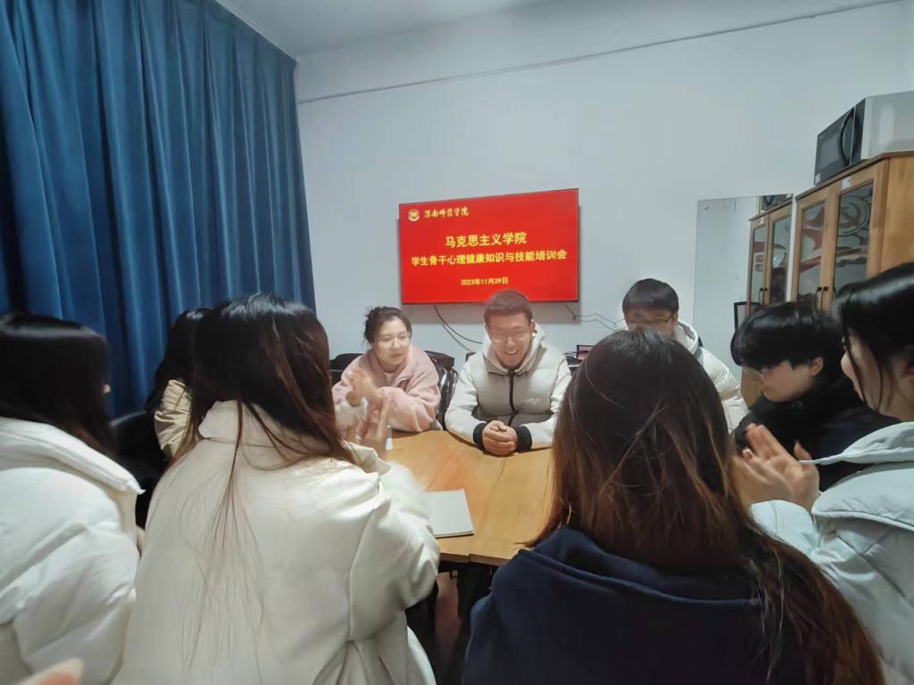 11月29日上午,马克思主义学院在学生社区党支部党团活动室召开学生骨干心理健康知识与技能培训会,学院团委负责人、心理专干关帅老师,辅导员陈晨以及2022级、2023级全体心理委员参加了此次培训会。