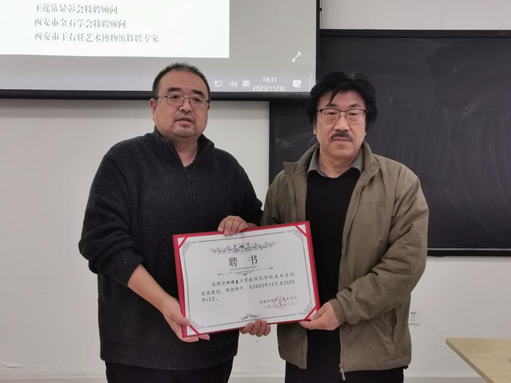 美术学院院长殷晓克为祁硕森教授颁发了欧宝娱乐官方app美术学院客座教授的聘书。