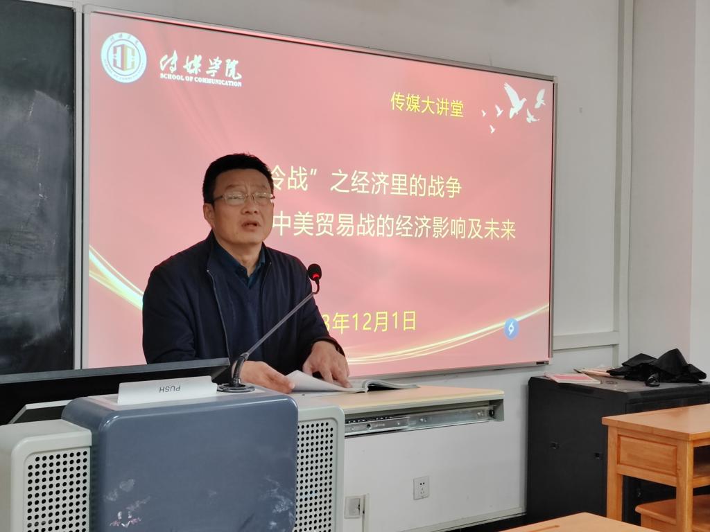 12月1日上午,传媒学院举办企业博士报告会。学院邀请冯照桢博士作题为“’新冷战’”之经济里的战争——中美贸易战的经济影响及未来”专题报告。学院2023级广播电视编导、动画专业60余名学生参加报告会,报告会由院长曹熙斌主持。