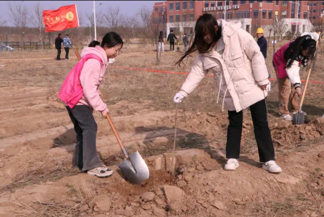 植树现场同学们挥洒青春的汗水,在实践中感悟自然,学习雷锋精神。在简短的启动仪式后,老师们首先示范了正确的植树方法,然后学生们便分组开始行动起来。植树现场中同学们积极发扬不怕苦、不怕脏、不怕累的精神,有的搬运树苗、有的铲土挖坑、有的提苗扶正、有的填土平整……大家分工明确、相互配合,栽种环节井然有序。