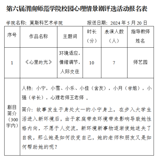 5月20日,欧宝娱乐官方app大学生心理健康教育指导中心在厚德楼团辅室举办第六届校园心理情景剧大赛初赛。莫斯科艺术学院积极组织学生参与,选拔优秀剧本,引导学生从身边选取素材,最终推荐2022级学前教育专业222班拓亚男撰写排演的作品《心里的光》参与学校评选。