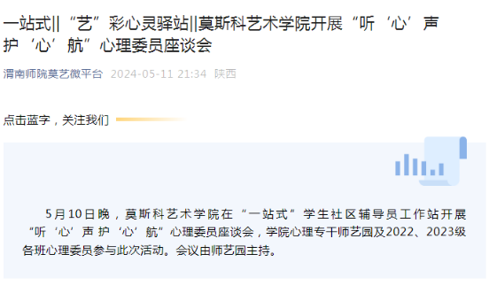 5月10日,莫斯科艺术学院在“一站式”学生社区辅导员工作站开展“听‘心’声 护‘心’航”心理委员座谈会,学院心理专干师艺园及2022、2023级各班心理委员参与此次活动。本次心理座谈会活动,使心理委员进一步明确工作职责,加强了责任意识,持续做好学生与老师之间的纽带作用,为学院日后心理健康相关工作打下坚实基础。