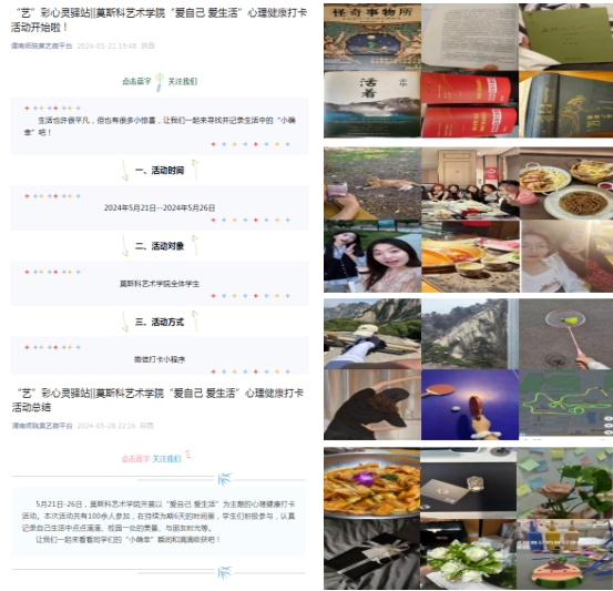 5月21日-26日,莫斯科艺术学院开展以“爱自己 爱生活”为主题的心理健康打卡活动。本次活动共有100余人参加,在持续为期6天的时间里,学生们积极参与,认真记录自己生活中点点滴滴、校园一处的美景、与朋友时光等。