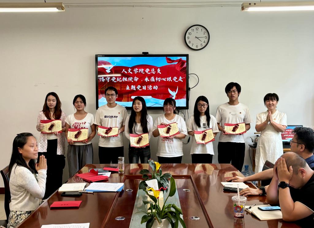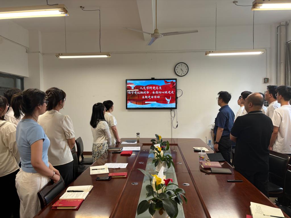 为献礼“七一”建党节, 6月28日下午,人文学院党总支在博识楼1318会议室召开“恪守党纪担使命 永葆初心跟党走”主题党日活动,学院处科级干部、学生党支部书记、支部委员、辅导员以及学生第一党支部全体学生党员参加活动,活动由该院党务秘书乔晓琼主持。