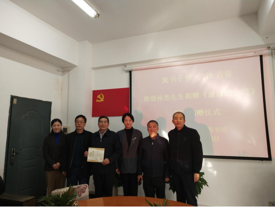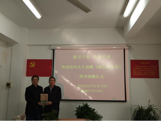 11月4日下午,孙杰先生向我校图书馆捐赠文学专著《最后的金莲》(人民日报出版社)6册。