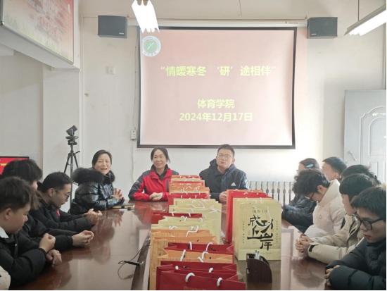 12月17日,体育学院在学院会议室为考研学子送上暖心大礼包。党总支书记李春兰、副书记闵雄飞、学工办主任朱颖妮以及备战考研的同学们参加了此次活动。