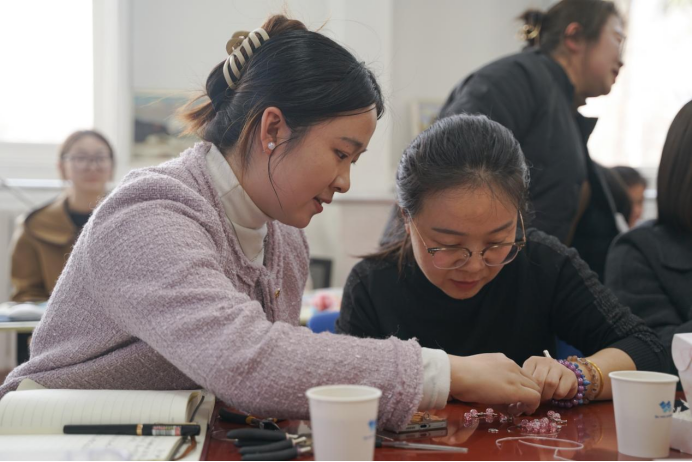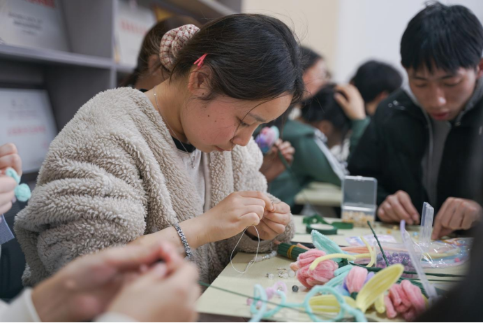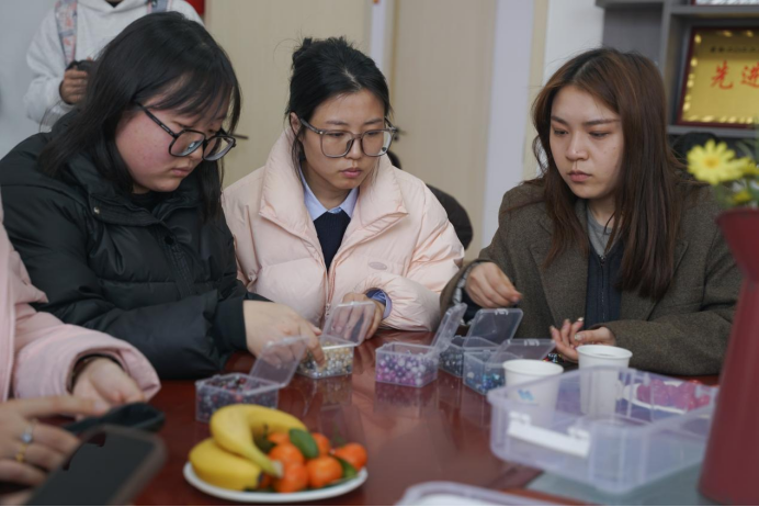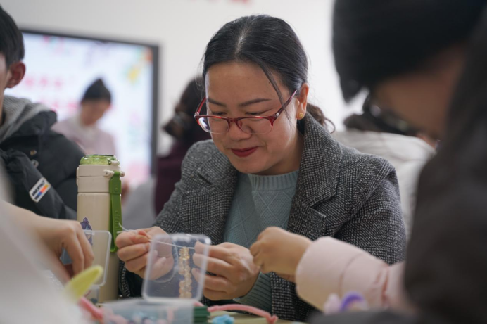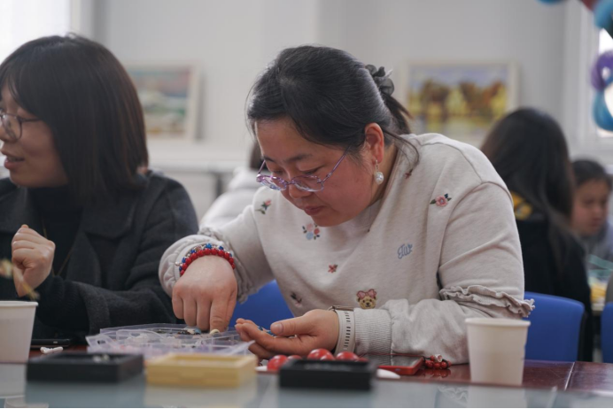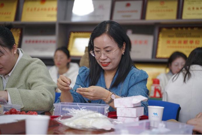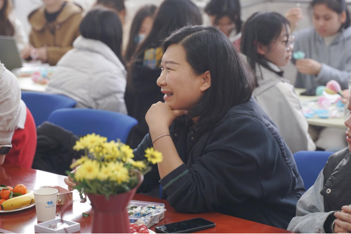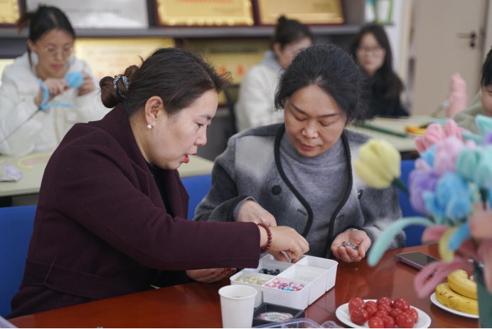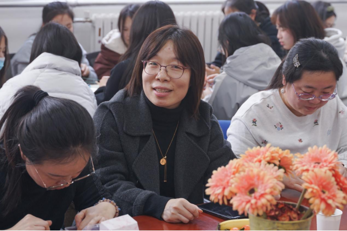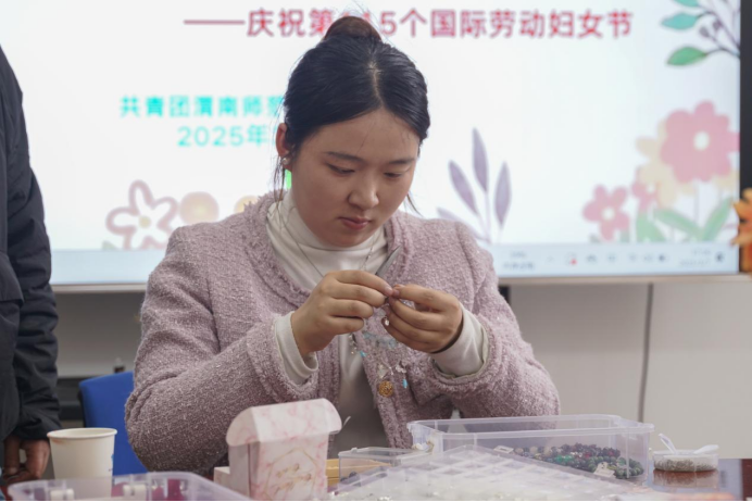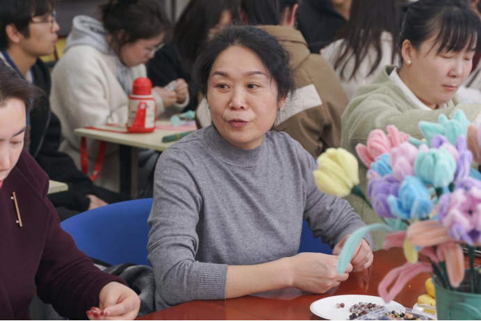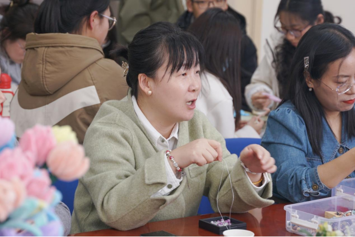 在手工制作环节,现场氛围愈发融洽。师生们围坐在一起,温情交流,共同编撰串珠手链、制作扭扭花等精美手工艺品。在一双双巧手下,普通的材料逐渐变成了一件件饱含心意的艺术品。大家相互学习、互相帮助,欢声笑语回荡在整个活动现场。这一环节不仅充分展现了女教职工们的心灵手巧,更传递出她们对美好生活的无限热爱与向往,也体现了老师们乐教爱生、春风化雨的教育情怀,知识与温暖在潜移默化中传递,滋润着每一位学生的心田。