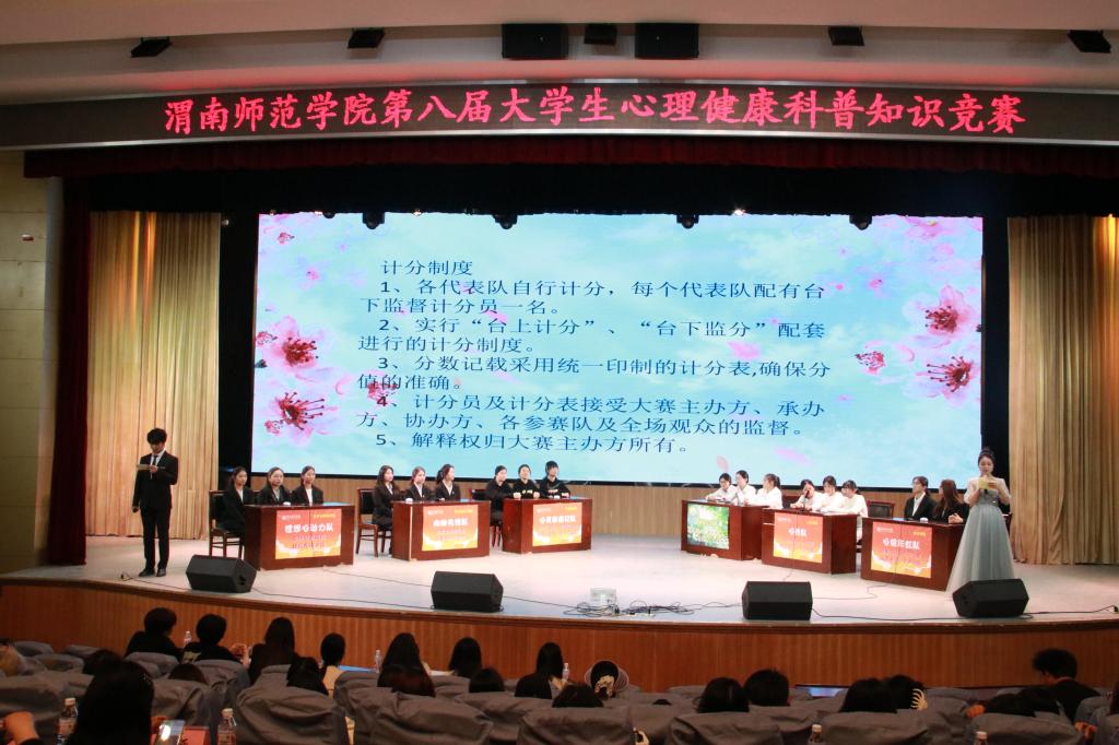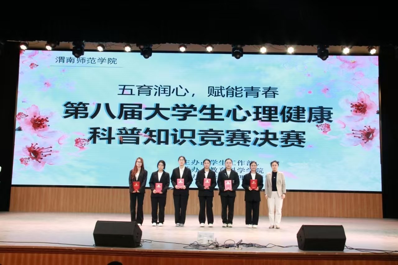 4月15日下午,我校第八届大学生心理健康科普知识竞赛决赛在陶然楼演艺厅落下帷幕。本次活动由学生工作部主办,教育科学学院承办。渭南市委文明办副主任王婧、渭南市中心医院精神心理科副主任张艳担任本次大赛嘉宾。